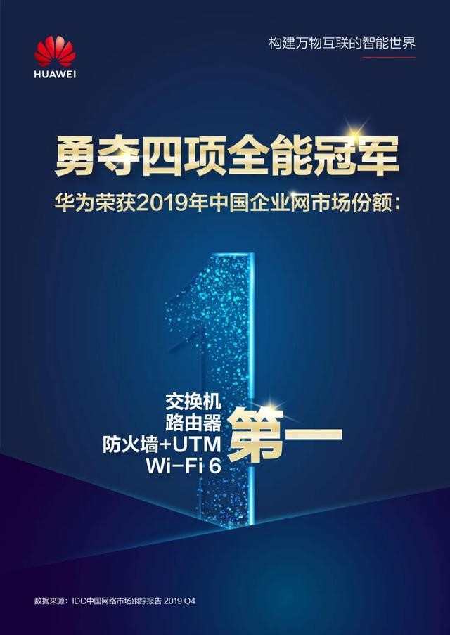 近日,全球咨詢與服務(wù)機(jī)構(gòu)IDC發(fā)布了2019年網(wǎng)絡(luò)市場(chǎng)第四季度調(diào)研報(bào)告。報(bào)告顯示,華為繼續(xù)在中國(guó)的企業(yè)網(wǎng)絡(luò)領(lǐng)域領(lǐng)先,2019年全年不僅獲得了企業(yè)網(wǎng)交換機(jī)、路由器、防火墻+UTM等傳統(tǒng)市場(chǎng)份額第一,也獲得了Wi-Fi 6等新興市場(chǎng)的市場(chǎng)份額冠軍,同時(shí)這也是華為連續(xù)第四年保持市場(chǎng)份額第一的地位。