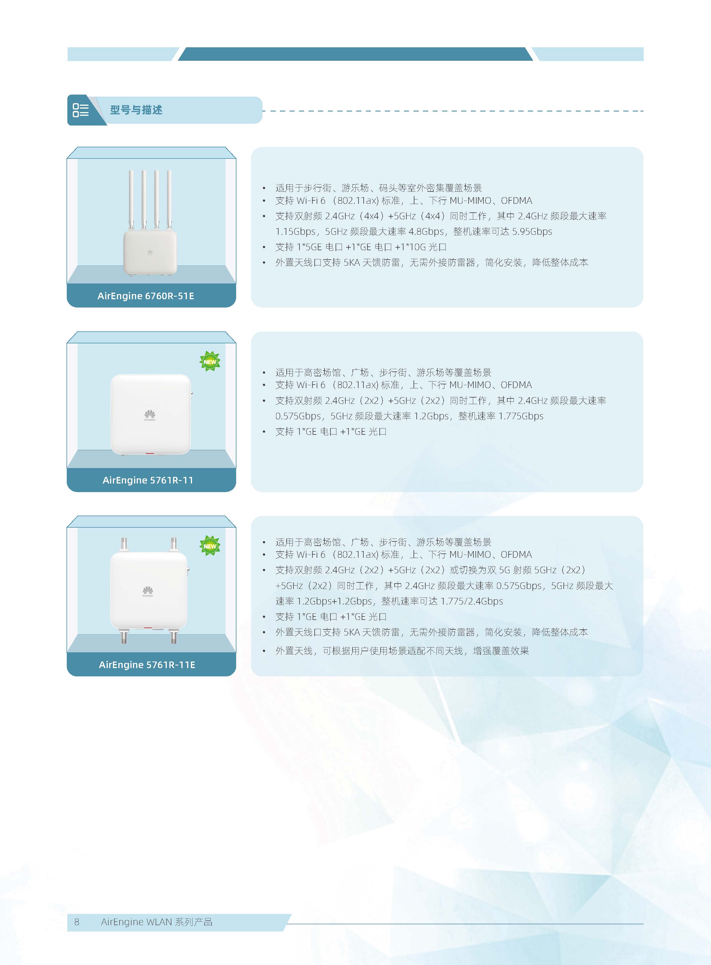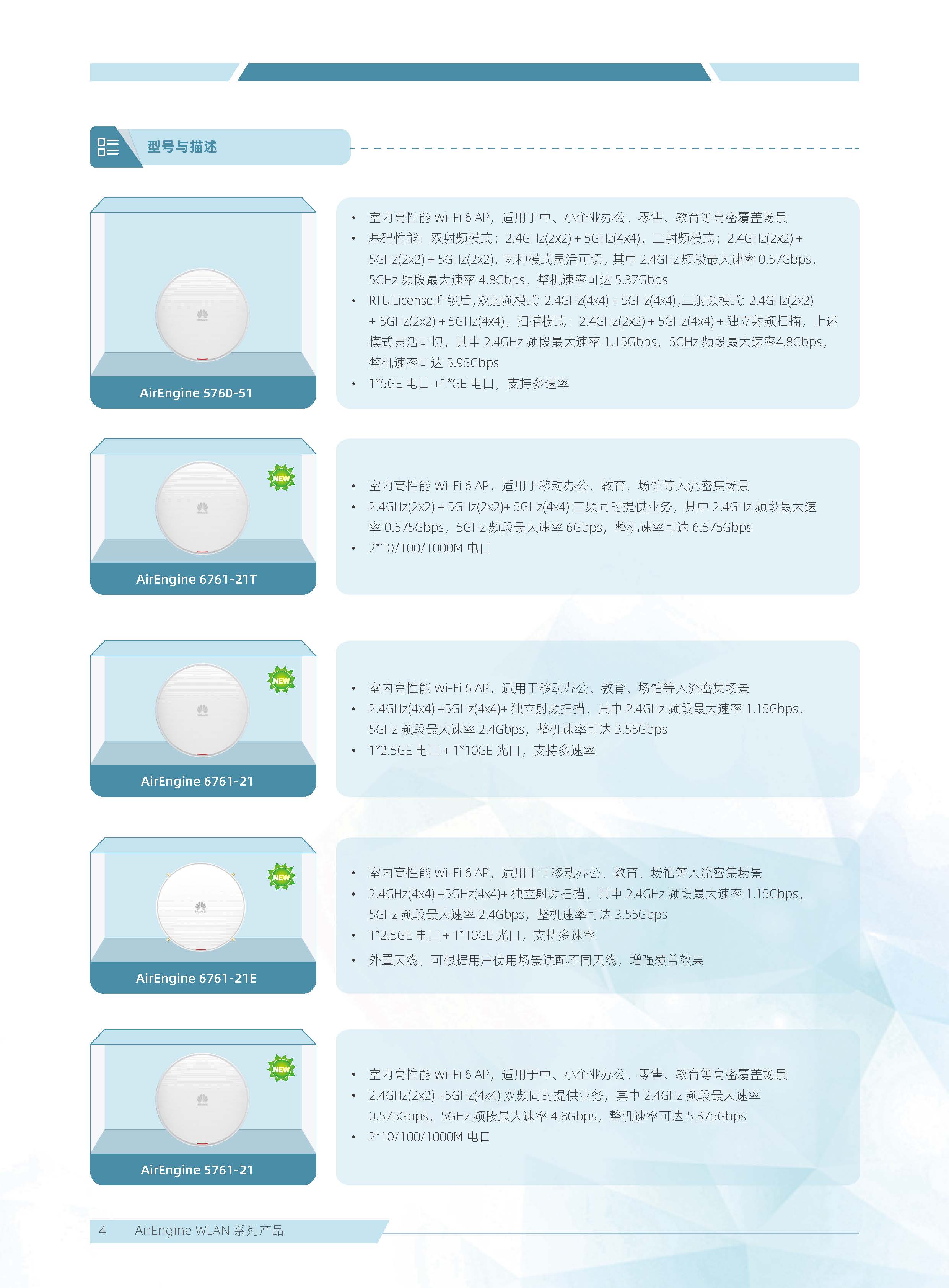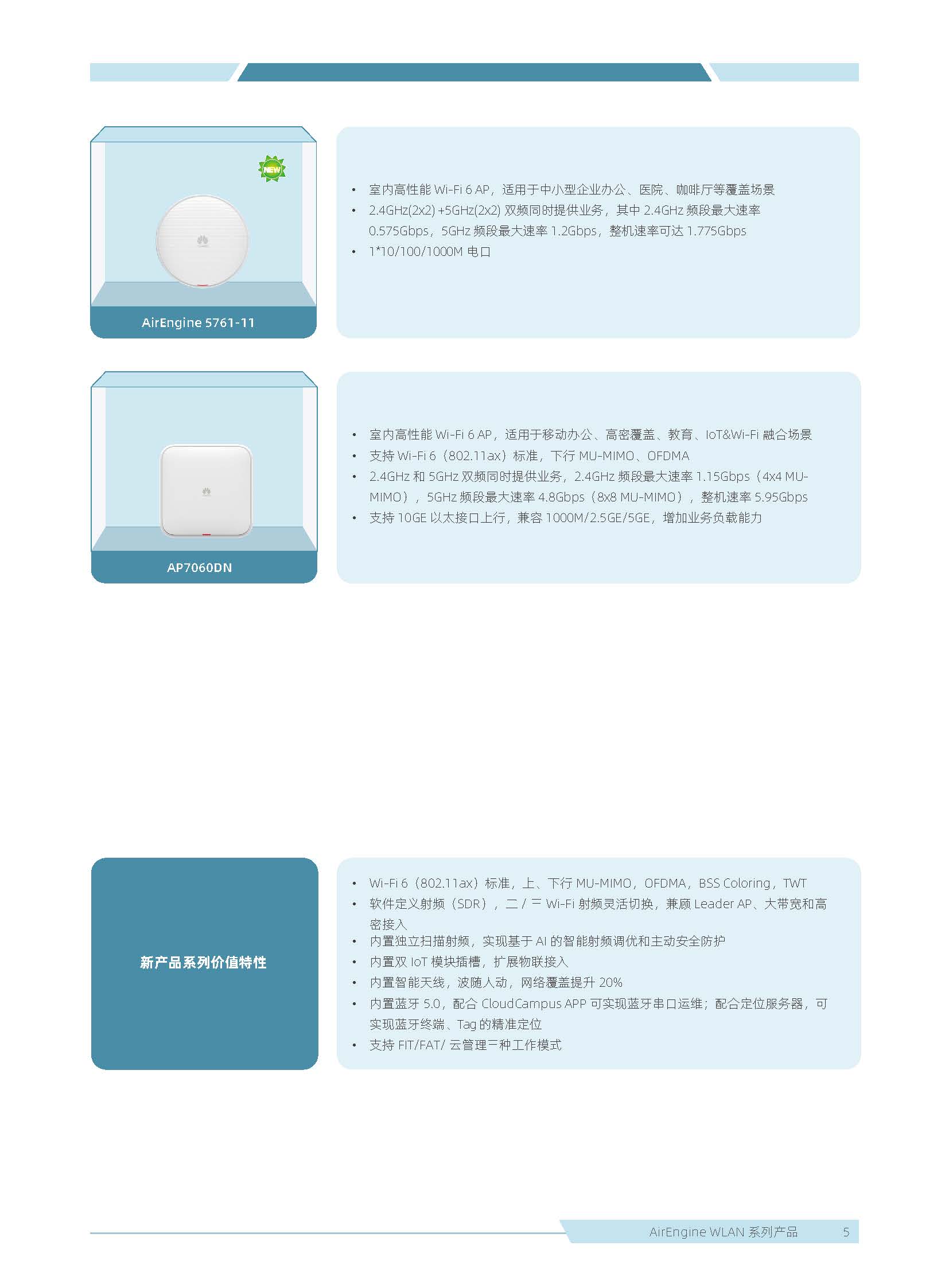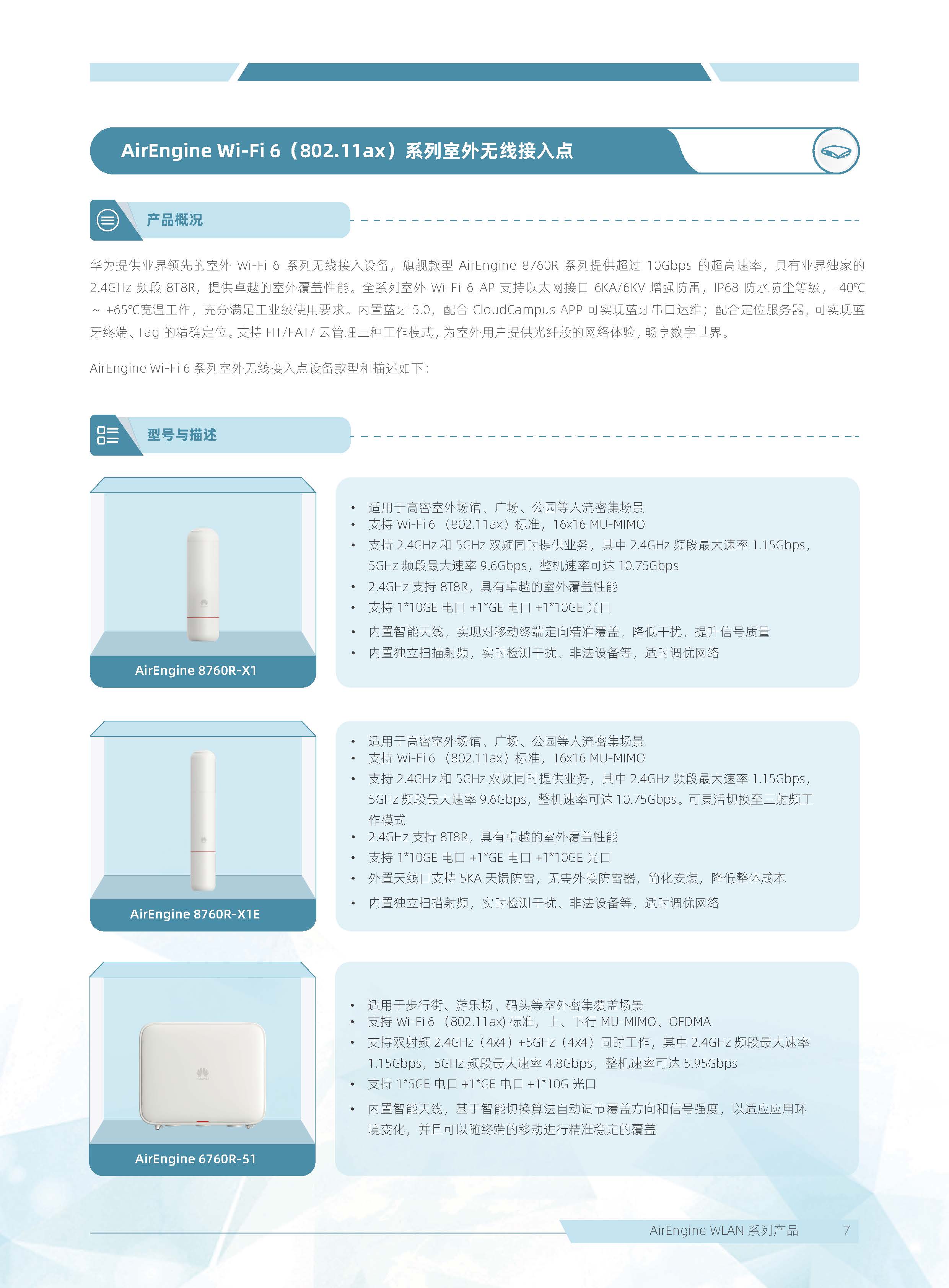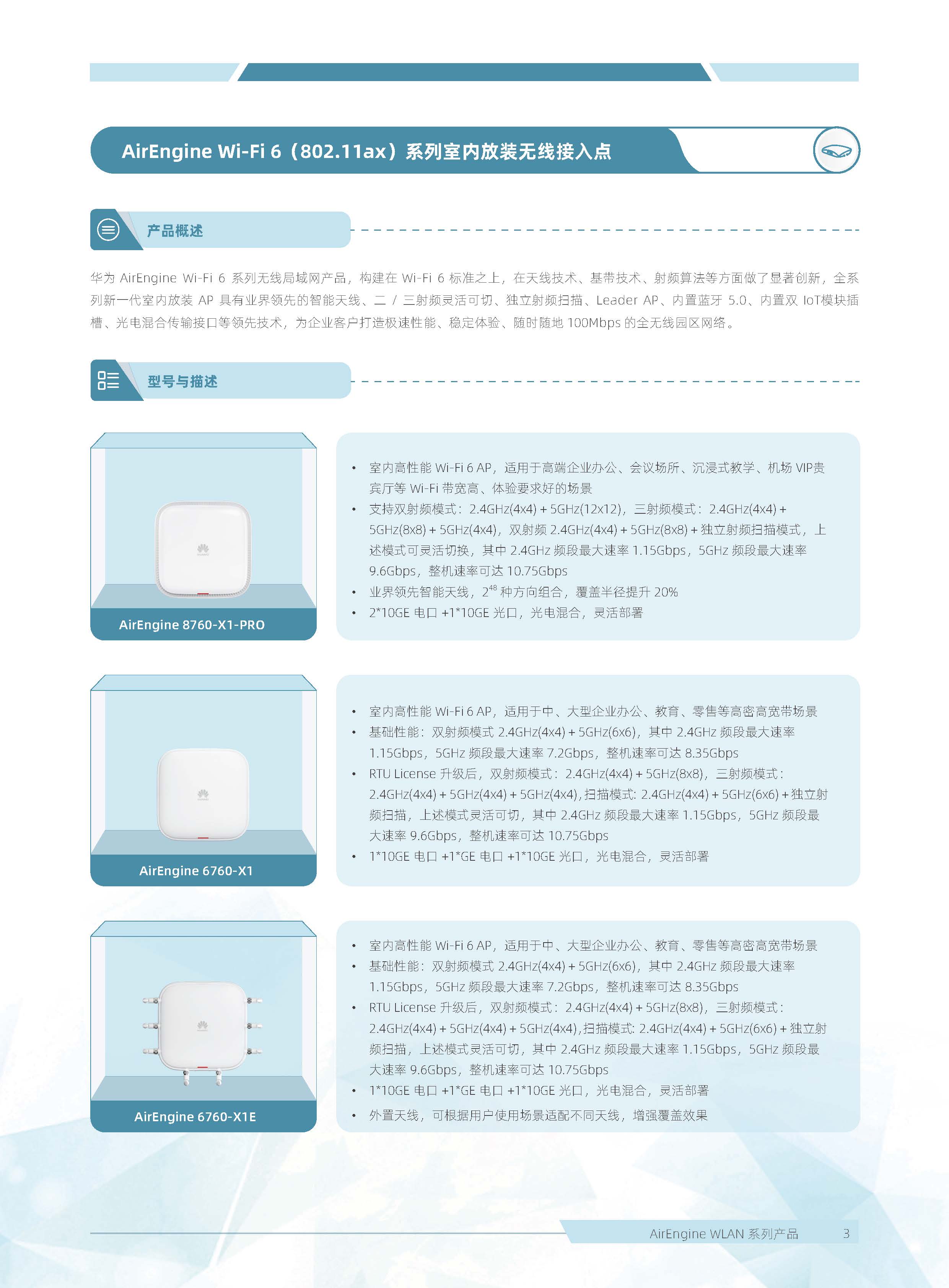 華為 AirEngine Wi-Fi 6 系列無線局域網(wǎng)產(chǎn)品,構(gòu)建在 Wi-Fi 6 標(biāo)準(zhǔn)之上,在天線技術(shù)、基帶技術(shù)、射頻算法等方面做了顯著創(chuàng)新,全系列新一代室內(nèi)放裝 AP 具有業(yè)界領(lǐng)先的智能天線、二 / 三射頻靈活可切、獨(dú)立射頻掃描、內(nèi)置藍(lán)牙 5.0,內(nèi)置雙 IoT 模塊卡槽、光電混合傳輸接口等領(lǐng)先技術(shù),為企業(yè)客戶打造極速性能、穩(wěn)定體驗(yàn)、隨時(shí)隨地 100Mbps 的全無線園區(qū)網(wǎng)絡(luò)