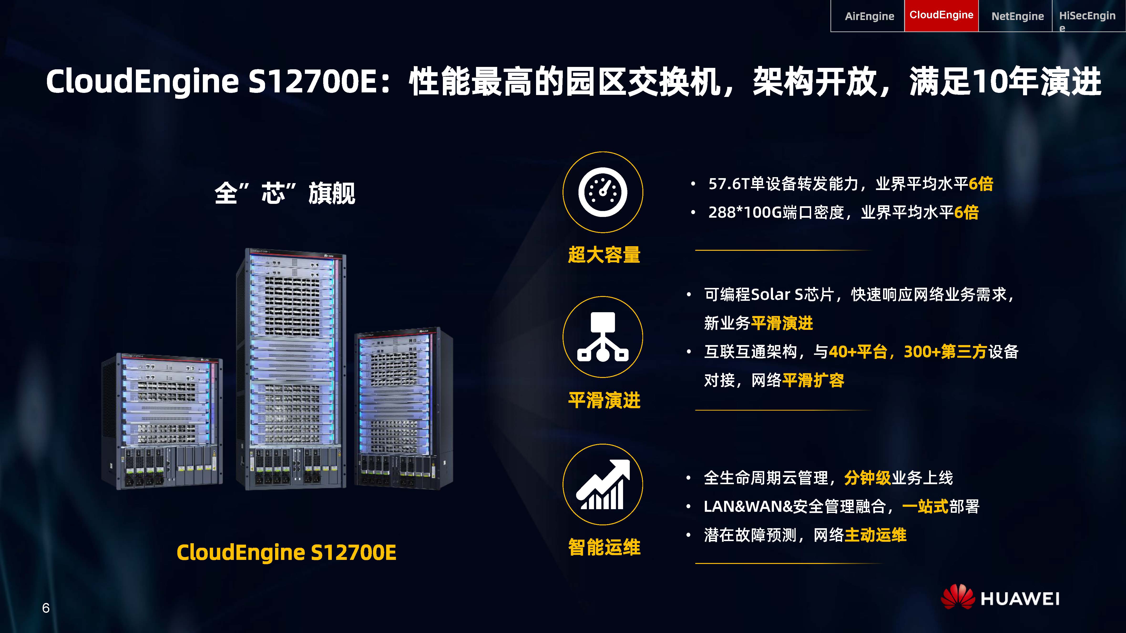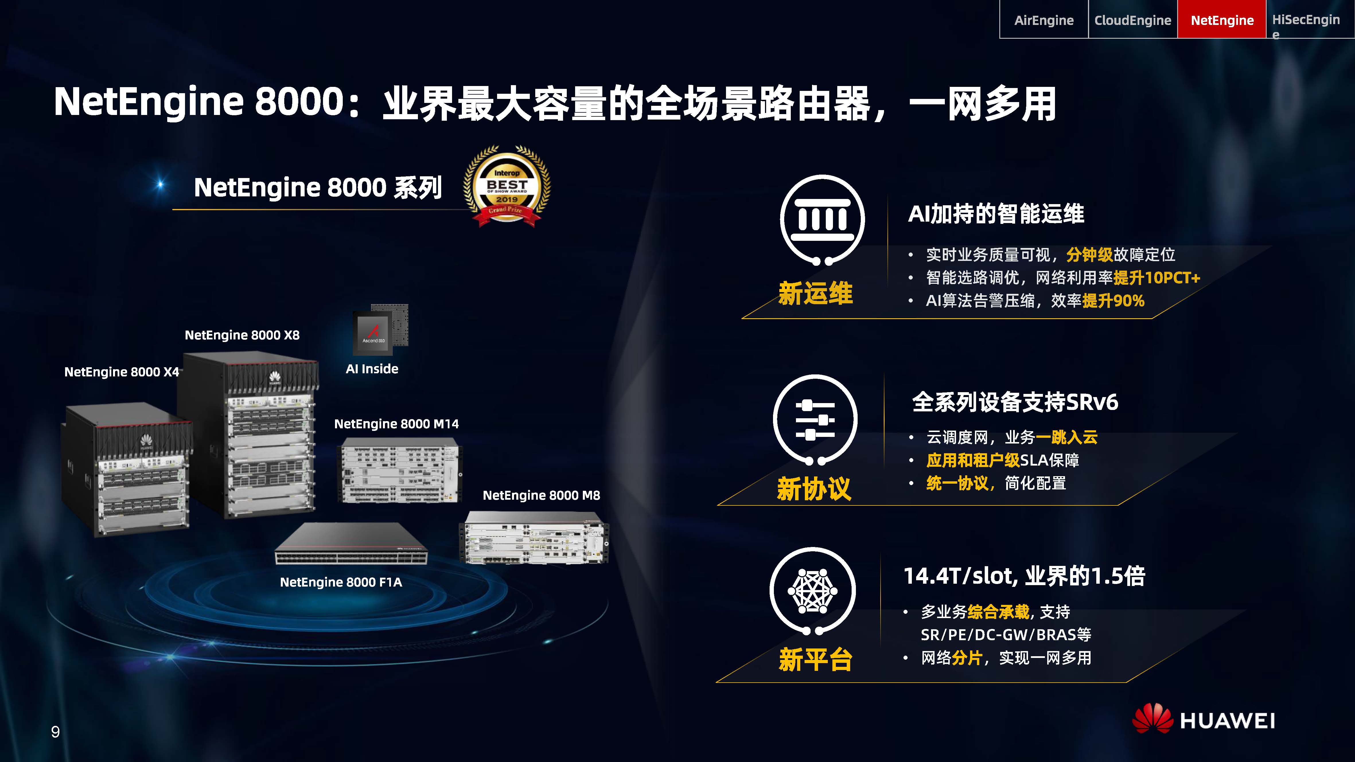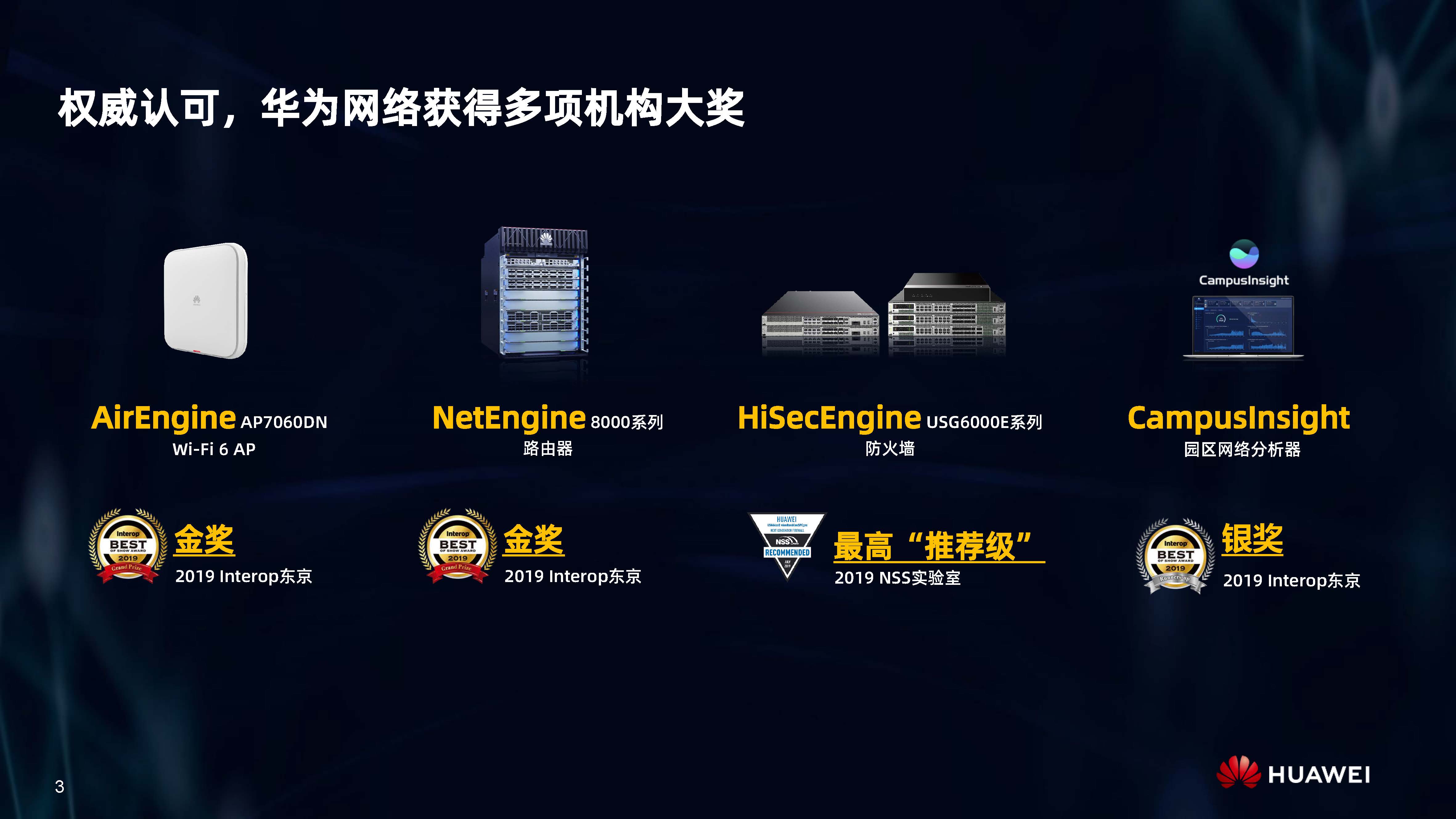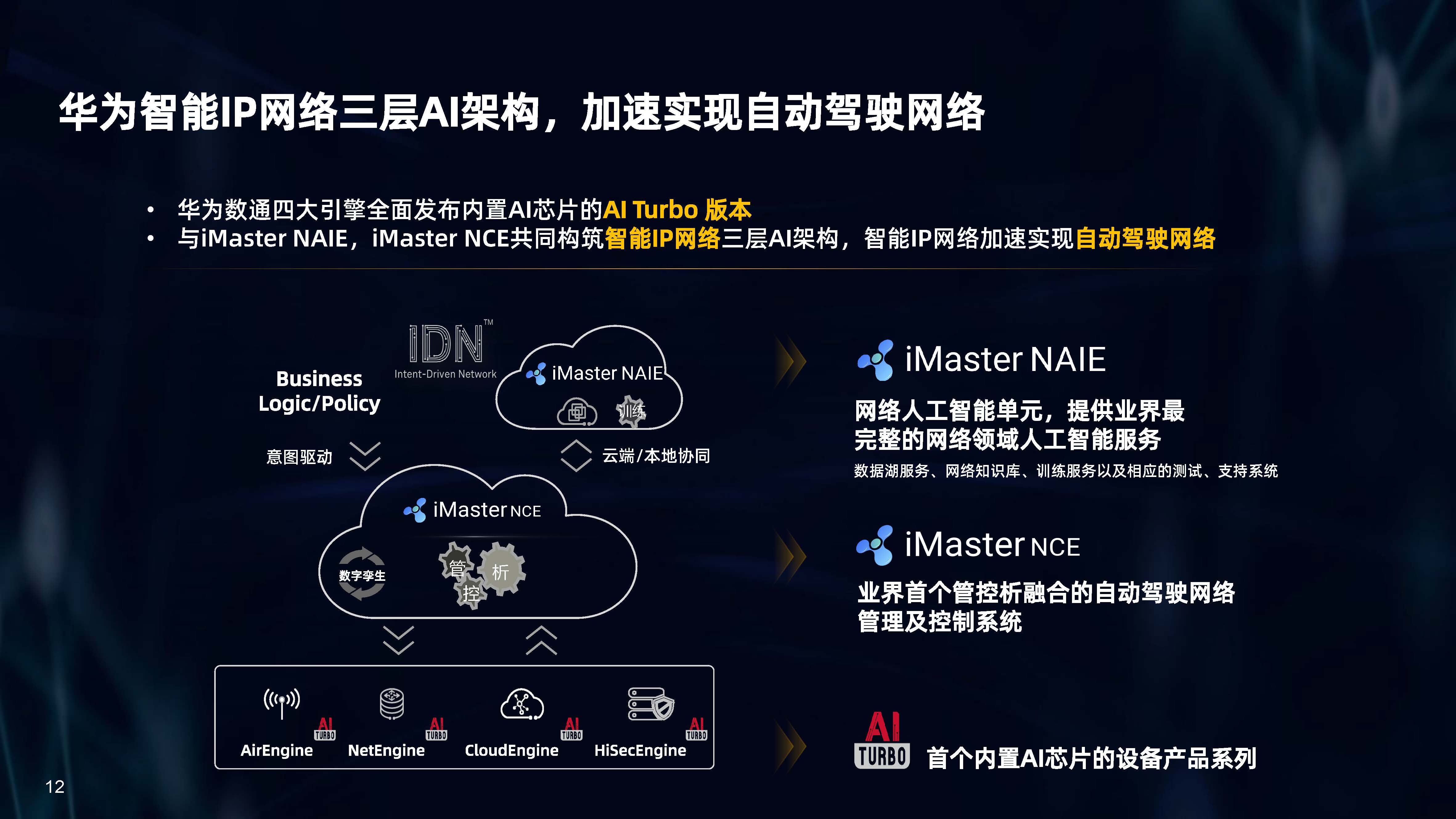 設備層AI,是內置人工智能芯片的AI Turbo設備系列,涵蓋了AirEngine Wi-Fi 6、CloudEngine交換機、NetEngine路由器、HiSecEngine安全網關等四大品類;網絡層AI,是iMaster NCE自動駕駛網絡管理與控制系統;云端AI,是業界首個網絡人工智能平臺iMaster NAIE。三層AI架構全面提升IP網絡智能化水平,引領智能IP網絡新時代。