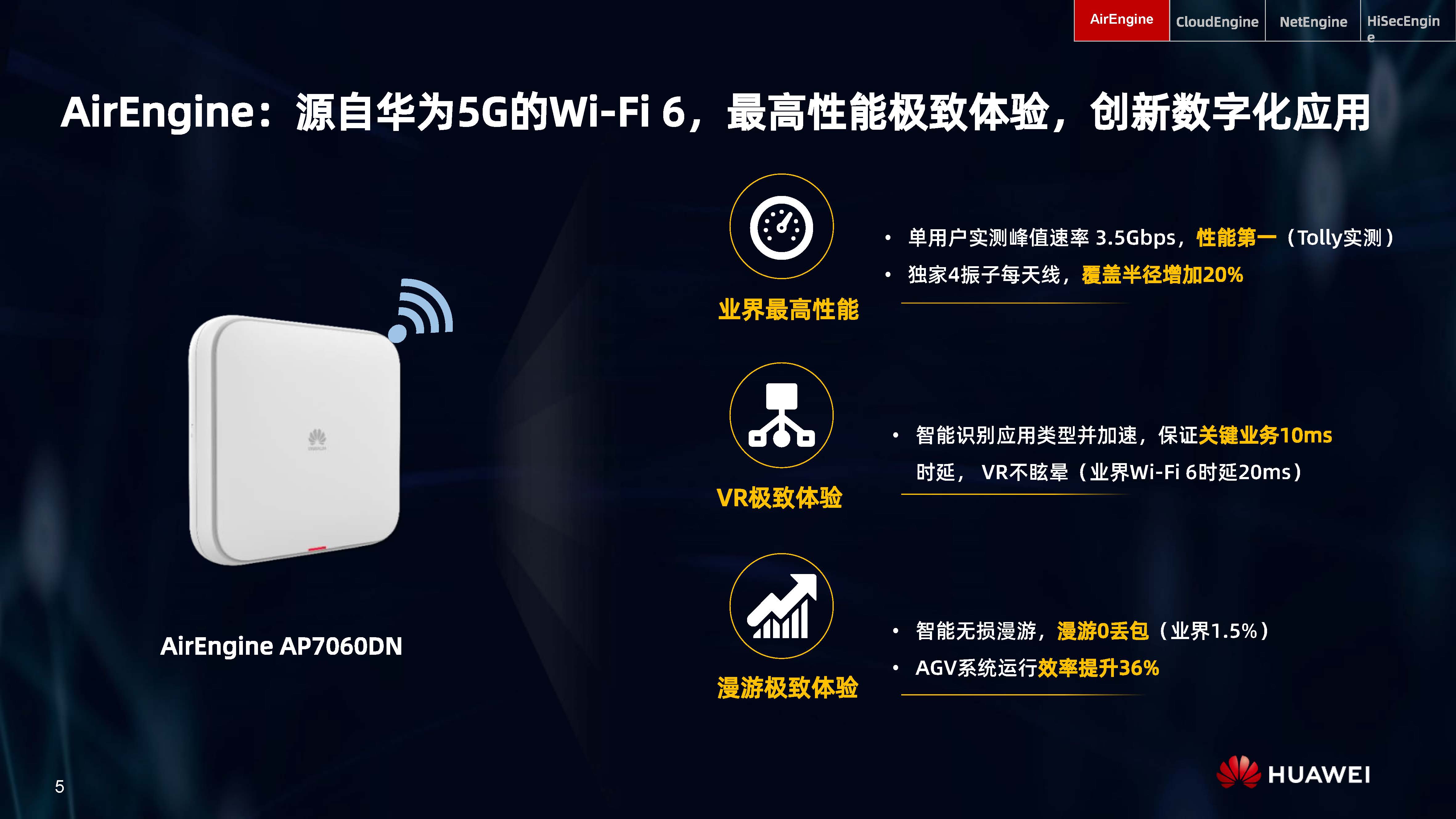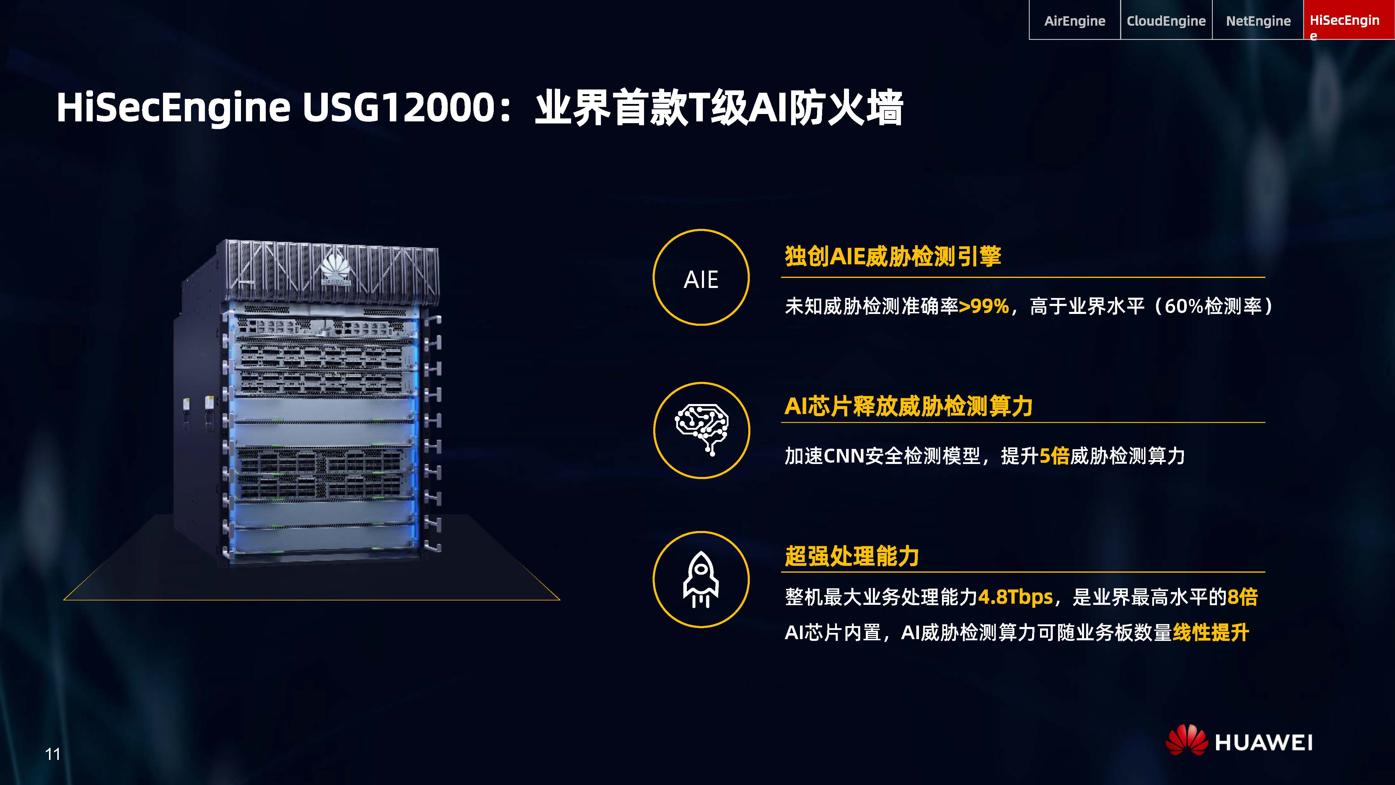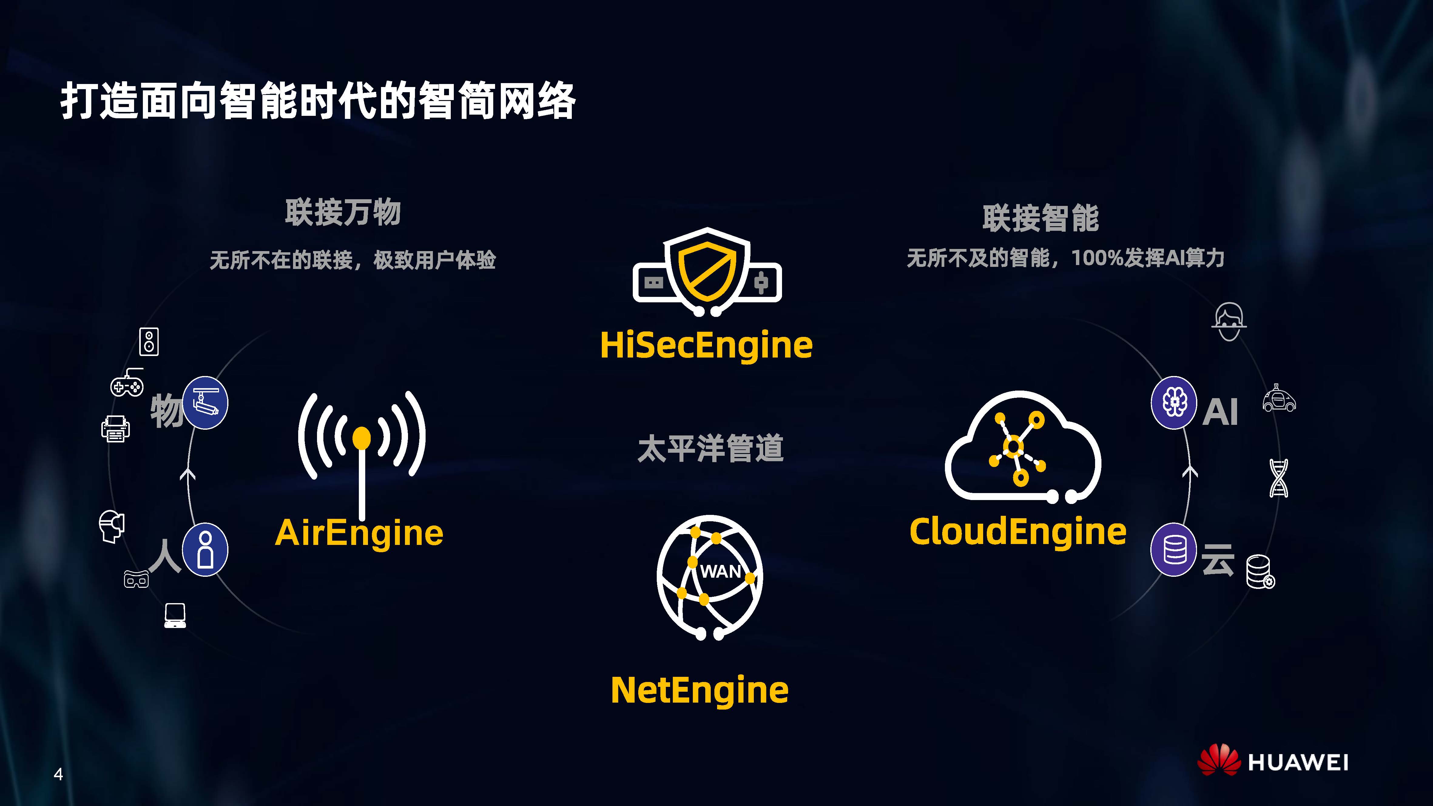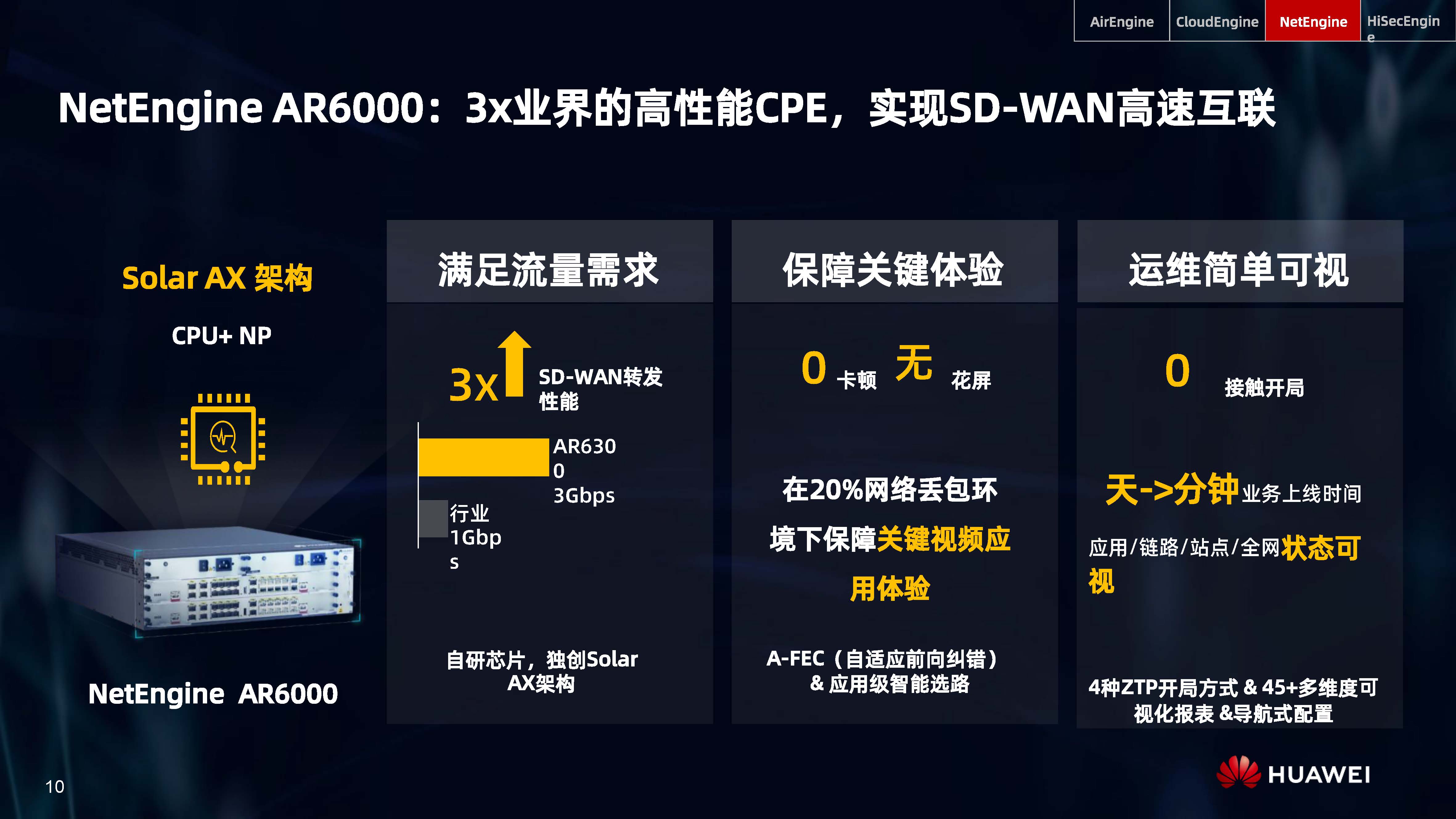 設備層AI,是內置人工智能芯片的AI Turbo設備系列,涵蓋了AirEngine Wi-Fi 6、CloudEngine交換機、NetEngine路由器、HiSecEngine安全網關等四大品類;網絡層AI,是iMaster NCE自動駕駛網絡管理與控制系統;云端AI,是業界首個網絡人工智能平臺iMaster NAIE。三層AI架構全面提升IP網絡智能化水平,引領智能IP網絡新時代。